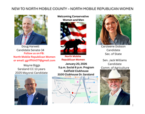 Talk personally with the candidates at 5pm. Program begins at 6pm. This month meet and hear Caroleen Dobson for Secretary of State, Doug Harwell for Senate 34, and Jack Williams for Agriculture Commissioner. Wayne Biggs, recent member of Saraland City Council and candidate for mayor of Saraland, and incumbent for Mobile County Republican Executive Committee will also speak.